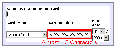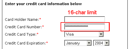 But I've observed one technique that has been nearly universal: the practice of refusing to allow spaces or dashes in credit card number entry fields (this example from The Teaching Company):