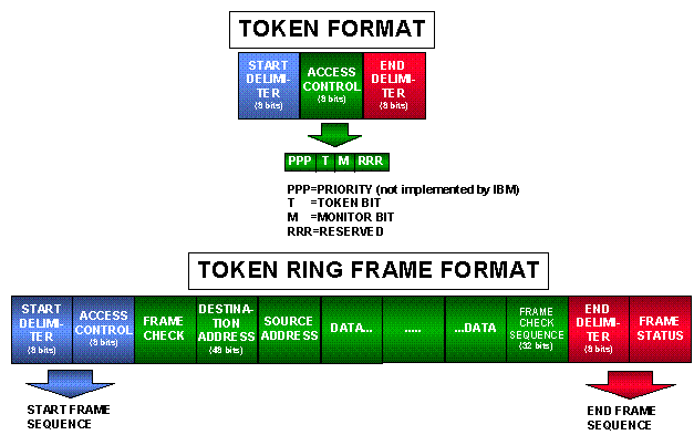 * physical topology is a "star", with the Multi-station Access Unit (MAU) at the "hub"; logical implementation is, of course, that of a ring Fig 2. The two basic Token Ring frame formats: the Token itself and a regular frame.